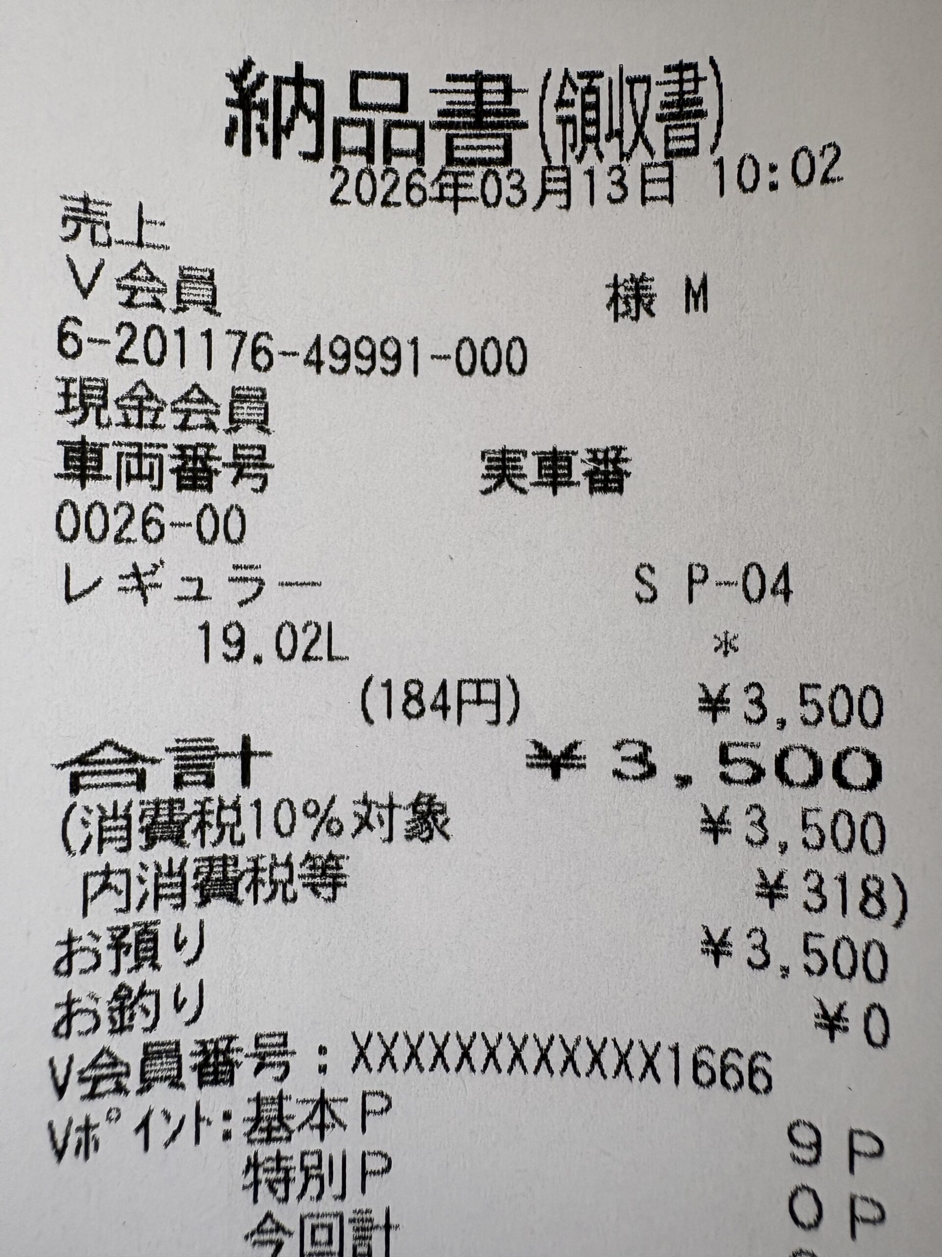 ガソリンは先週3月6日(金)に入れた際にはリッター¥148。